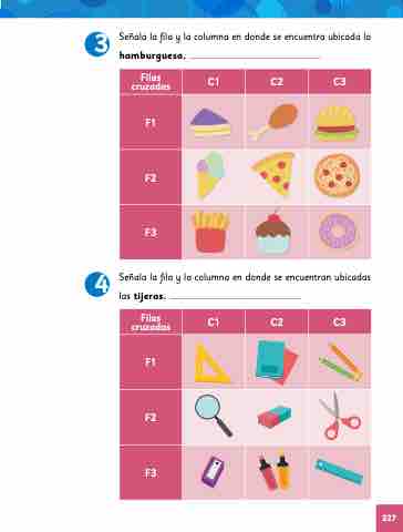 3 Señala la fila y la columna en donde se encuentra ubicada la hamburguesa. Filas cruzadas C1 C2 C3 F1 F2 F3 4 Señala la fila y la columna en donde se encuentran ubicadas las tijeras. Filas cruzadas C1 C2 C3 F1 F2 F3 227