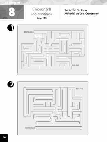E J E R C I C I O 8 Encuentra Encuentra Duración: Duración: Sin límite los caminos los caminos Material de uso: Material de uso: Cronómetro (pag. 198) 1 ENTRADA SALIDA 2 SALIDA ENTRADA 72 70